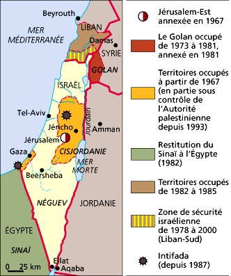 L'État d'Israël correspond à la partie occidentale de l'ancienne Palestine sous mandat britannique délimitée par les lignes d'armistice de 1949 à la suite de la guerre qui opposa les forces arabes au nouvel État proclamé en 1948, laissant à la Transjordanie d'importants secteurs à l'ouest du Jourdain (Cisjordanie) avec la vieille ville de Jérusalem. Vers le sud, le territoire israélien atteint en coin le golfe d'Aqaba, à Eilat. Depuis 1967, Israël occupe la Cisjordanie (site de colonies de peuplement) et la partie orientale de Jérusalem, ainsi que le Golan (ce dernier secteur a été annexé en 1981). À la suite de la reconnaissance mutuelle entre Israël et l'Organisation de libération de la Palestine (OLP), les accords de Washington (1993) prévoyaient les modalités d'autonomie pour les territoires occupés. Ils ont été complétés par l'accord intérimaire signé à Washington en 1995.